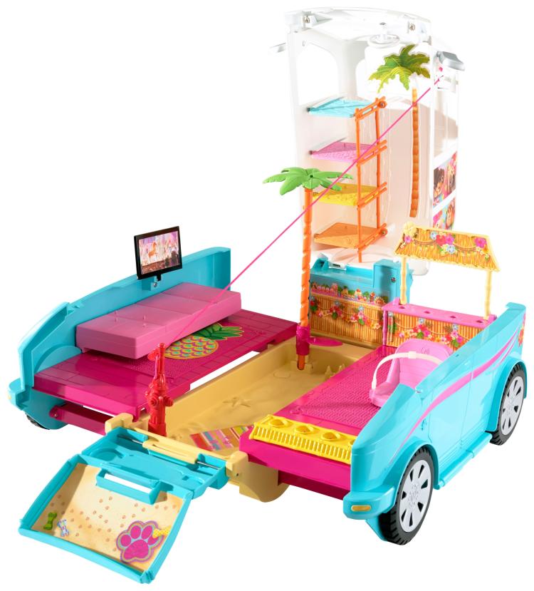 It’s the ultimate puppy mobile! Inspired by the film Barbie and Her Sisters in a Puppy Chase, this Barbie vehicle transforms from a sporty SUV to a pet playground paradise! Lift up the roof of the SUV and pull open its sides to reveal a deluxe island-inspired play area for the four puppies included!