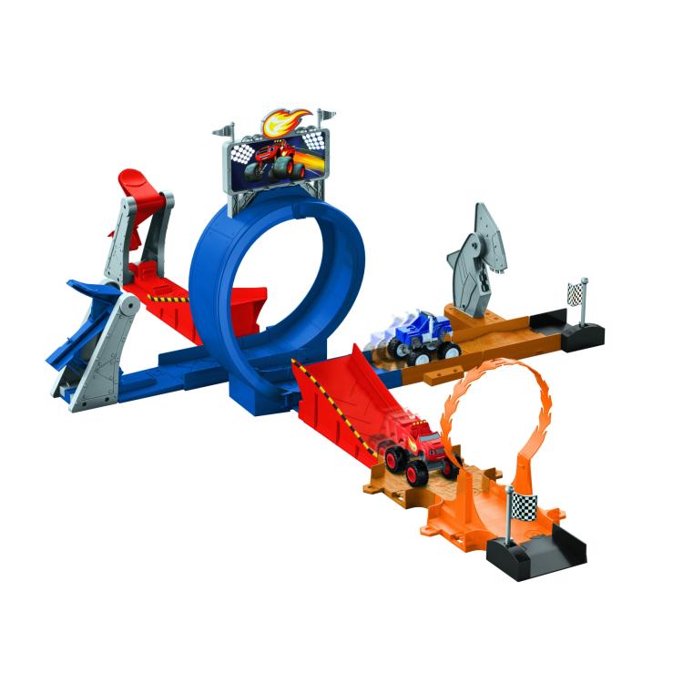 It’s Race Day at the Monster Dome and crafty Crusher will stop at nothing to beat Blaze... even if that means building a chomping Sharkbot! Will Blaze race past the shark’s mighty bite and speed on to win the race or will Crusher finally cross the finish line first? This track set can be configured into multiple layouts so race fans can recreate all the action and adventure of Blaze and the Monster Machines™! Using the two launchers, see if you can give the Monster Machines the speed and momentum they need to race around the track and perform spectacular stunts! Try to launch the trucks up the ramp and into a 360° loop or speed through the ring of fire!