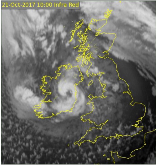 The image published by Met Éireann was captured from space at 10am on Saturday, October 21. It reveals a swirling mass of white cloud as it appears to pass directly over Offaly