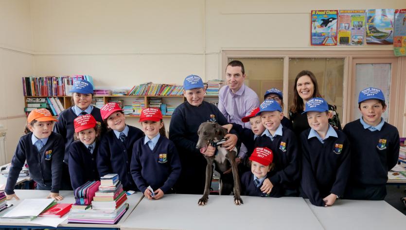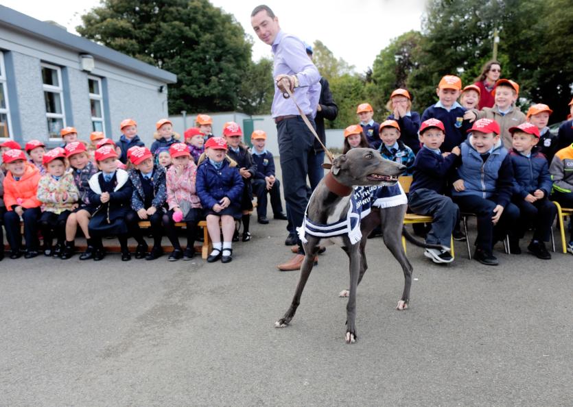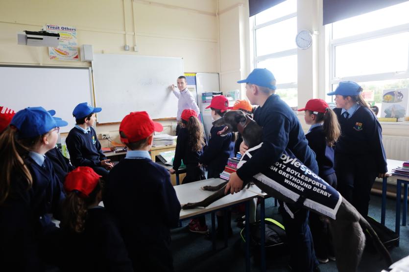 A special plaque was unveiled on the wall to honour Pat’s achievement as he showcased Good News and two retired greyhounds, Jack (black greyhound) and Saorla (fawn greyhound) before the excited primary school students.