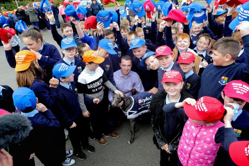 Pat Guilfoyle, winning trainer of the BoyleSports Irish Greyhound Derby 2017, attended a special ceremony in Rhode this morning celebrating his achievement before a packed crowd of parents, pupils and fellow teachers at Scoil Mhuire Naofa, Co. Offaly.