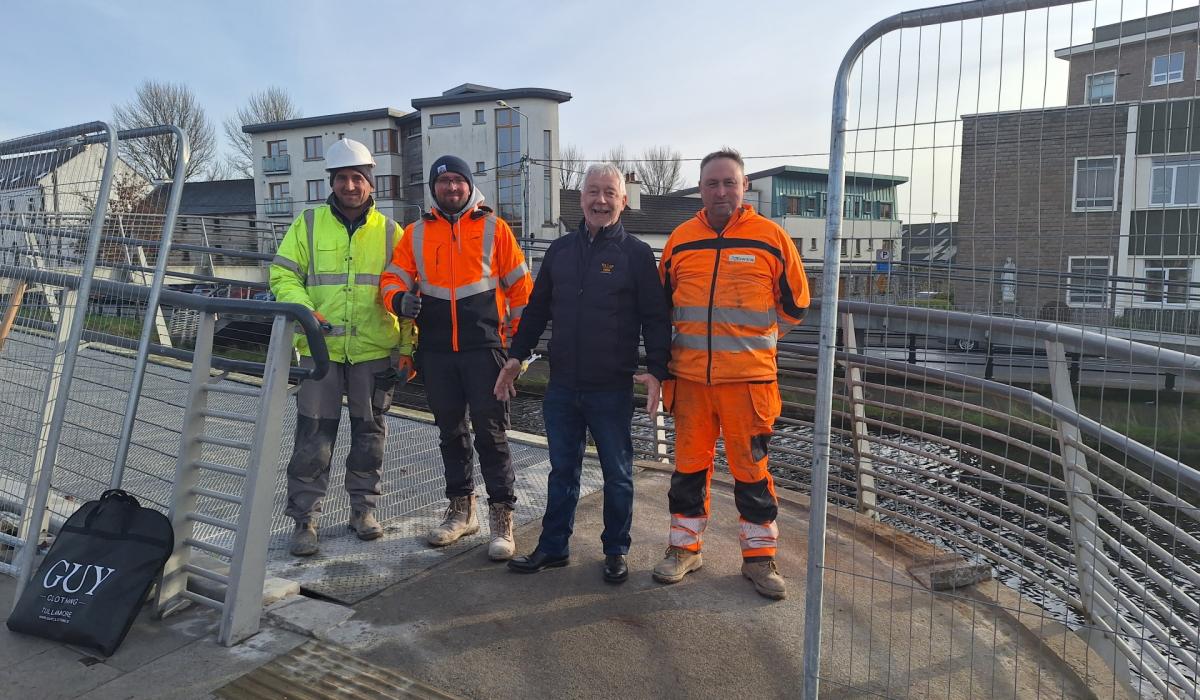 At the reopening of the footbridge were Cllr Declan Harvey with Tower workers (from left) Ille, Sean and Declan Carey