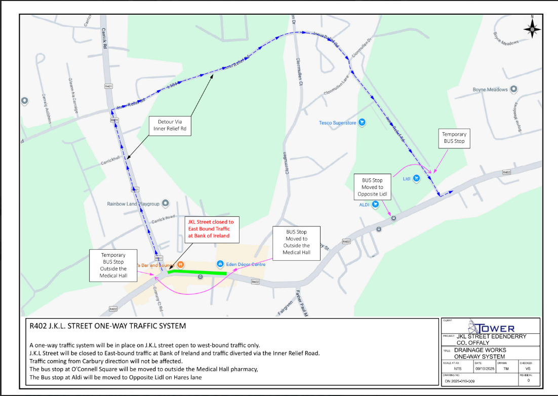 Part of the main street in Edenderry is set to become a one-way system from Wednesday, October 15, to December 12 to facilitate works on the new library development.