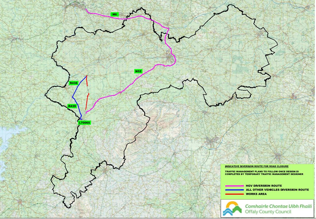 The HGV Diversion Route will bring vehicles via Tullamore, M6 Junction 8 to Junction 5 and N52 northbound and southbound.