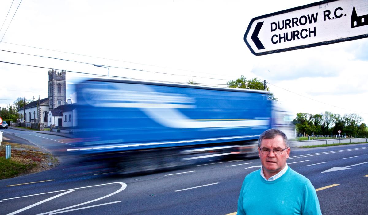 A lorry whizzes past Cllr Sean O'Brien on the main N52 road at Durrow. Pic: Michael McGrath