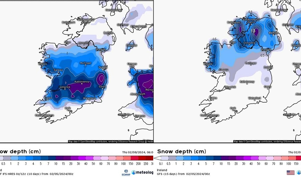 Weather Alerts Ireland posted the ECMWF and GFS morning model for snow depths for Ireland for Thursday and there is a huge difference between the two.