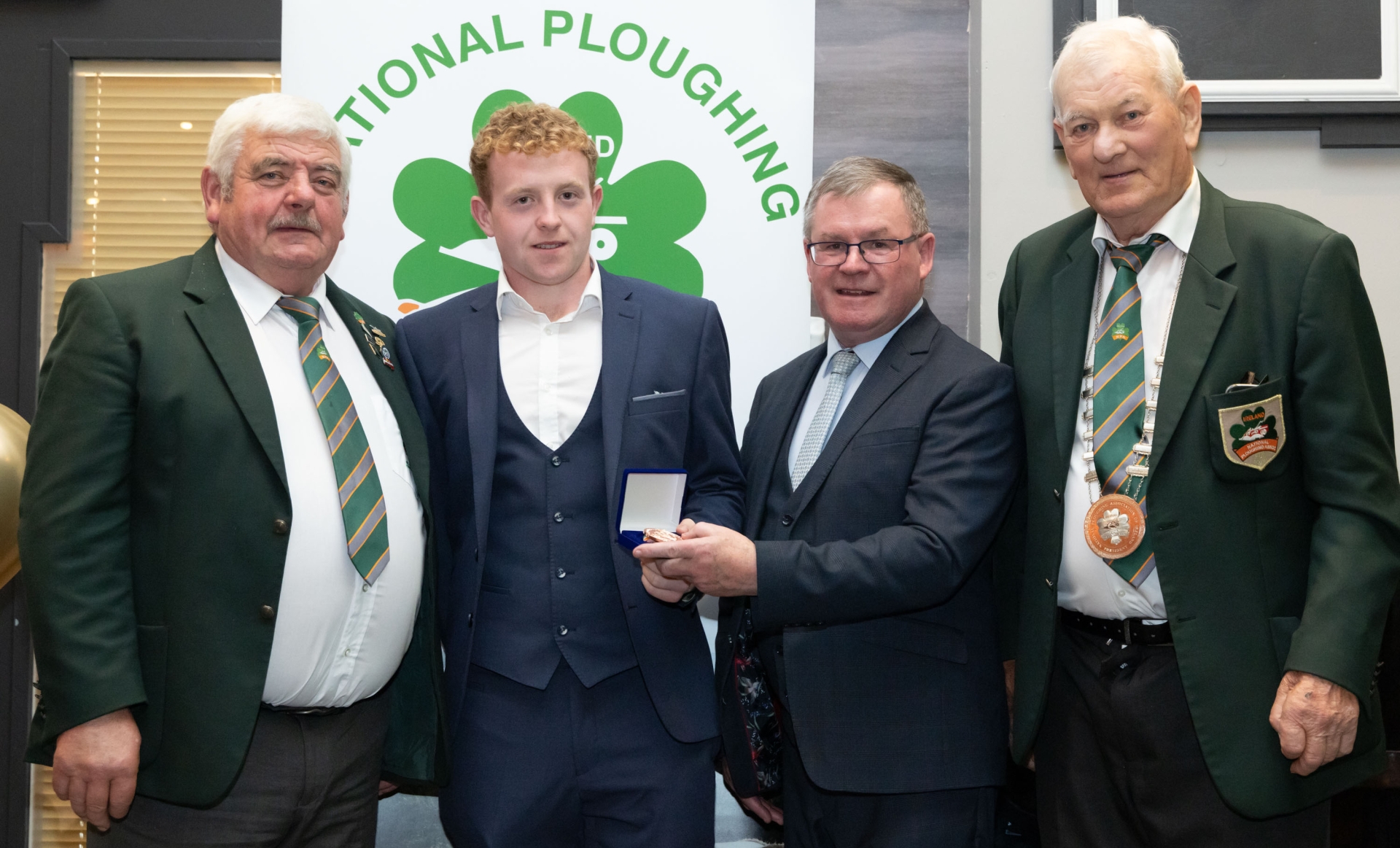 Diarmuid Bracken from Offaly is presented with a Bronze Medal for Standard 3 & 4 Furrow Reversible by NPA chairman John Deery, Cllr Sean O’Brien, Leas Cathaoirleach of Offaly County Council and NPA president Mick Mahon at the Ploughing 2025 awards in Tullamore
