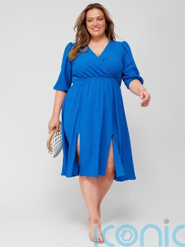 V by Very Curve V Neck Half Sleeve Textured Midi Dress – Blue, currently £26 (was £38), Very