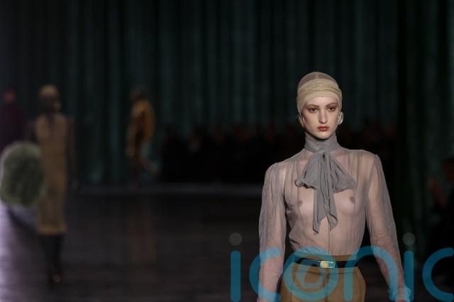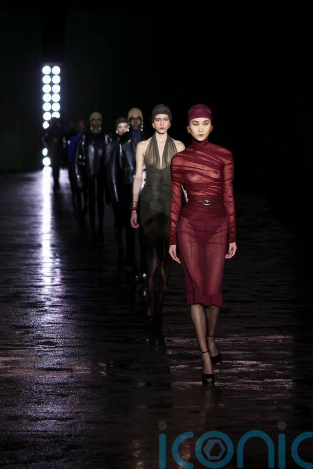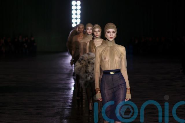 Creative director Anthony Vaccarello’s latest offering was dominated by see-through materials – from sheer skirts to lightweight, gossamer tops, and even the hosiery material models wore as hoods.