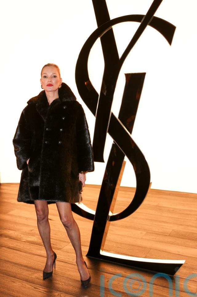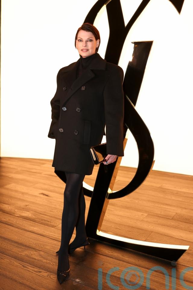 Evangelista – who walked the Yves Saint Laurent catwalk as early as the Eighties – was in a more demure outfit, wearing a double-breasted black coat with statement shoulders, a black turtleneck underneath and opaque tights.
