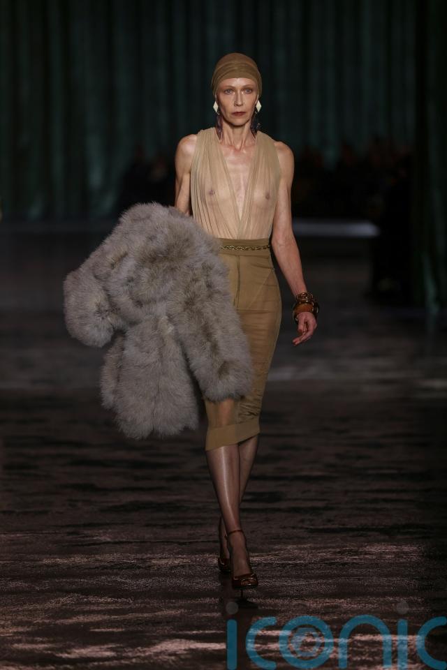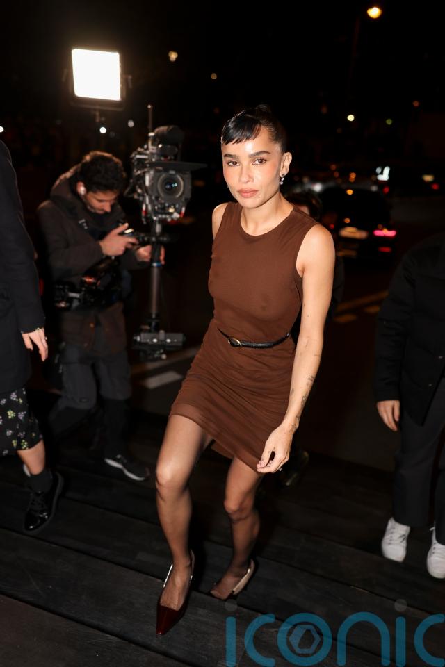 Meanwhile, The Batman star Zoe Kravitz – who is a regular face in Saint Laurent’s advertising campaigns – wore an almost imperceptibly sheer chocolate brown belted midi dress.