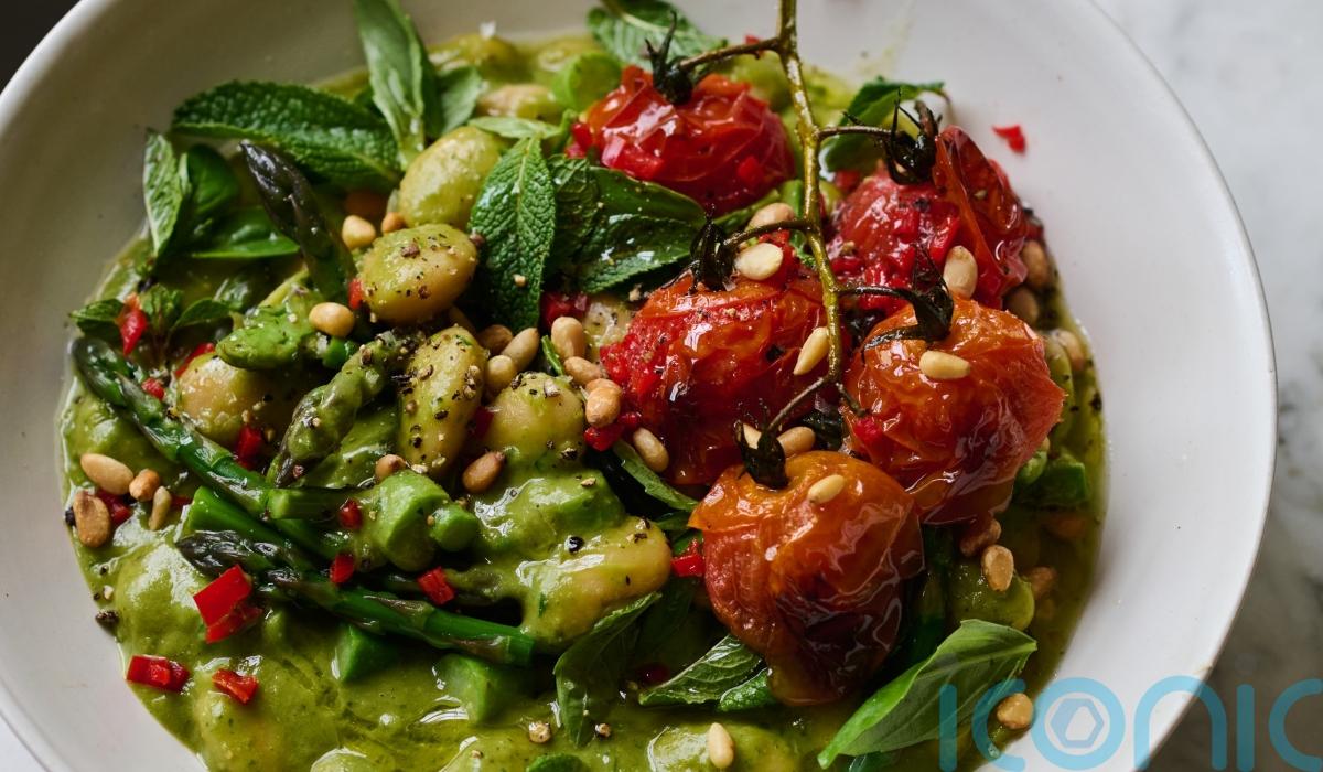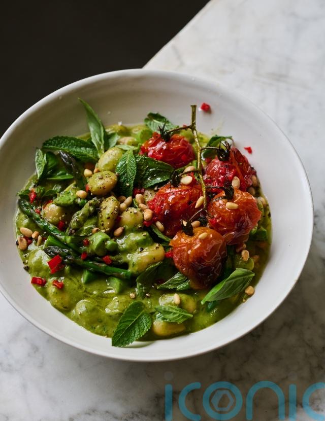5. Return the asparagus to the pan, swirl through the pesto and squeeze in the lemon juice. Scatter over the fresh mint, basil, pine nuts and chilli and top with the roasted tomatoes.