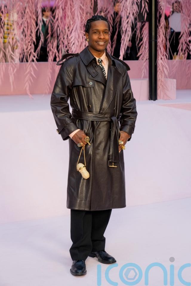 Rapper A$AP Rocky, whose long-term partner Rihanna attended the Dior haute couture show on Monday, kept it pared back in a brown leather trench and salmon shirt.