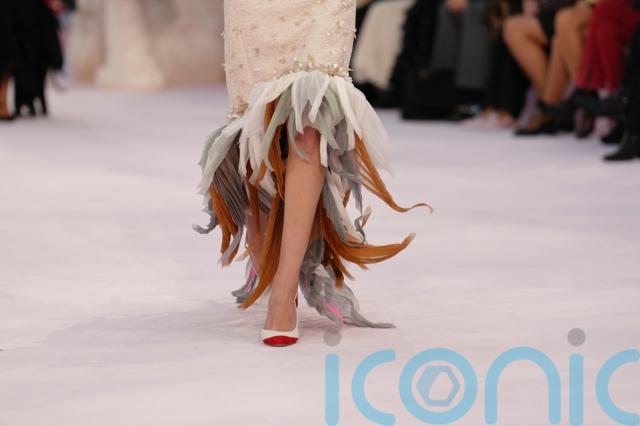 It echoed the iridescent, feathered accents seen at Jonathan Anderson’s Dior show on Monday, suggesting a wider couture shift towards the airborne lightness and a new kind of femininity that leans into fluid form and freedom, as opposed to rigid, binding structure.