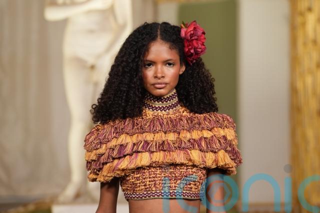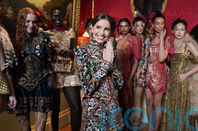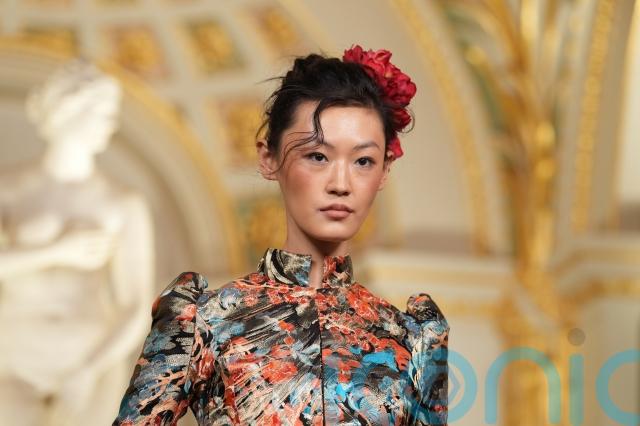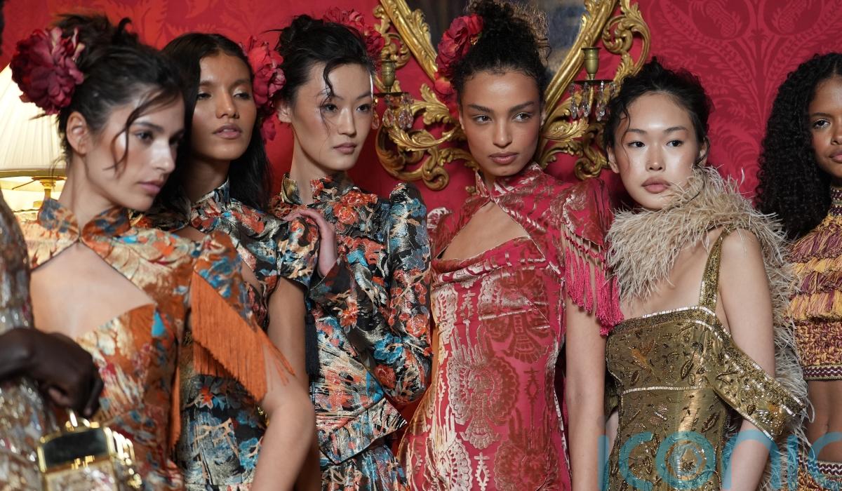 Texture played a central role. Tapestry-style florals in burnished orange, teal and gold were cut into high-necked dresses with sculpted shoulders, while metallic threads caught the light as the models turned.