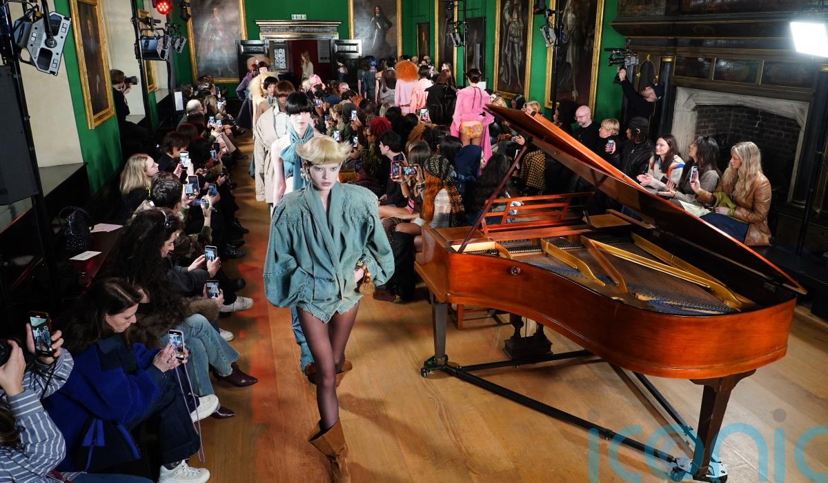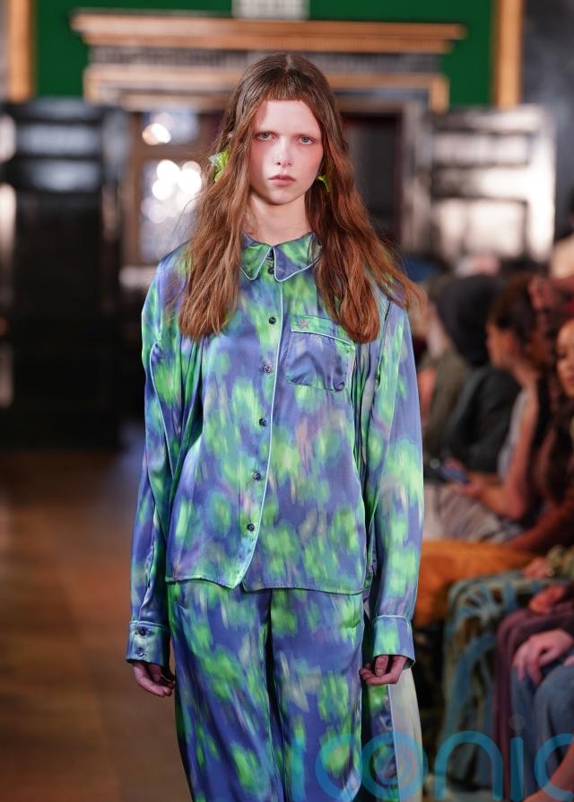 That introspection played out in garments that felt simultaneously private and performative, with lingerie accents, sleepwear details and distressed denim colliding against the historic grandeur of the venue’s green-panelled walls and oil portraits.