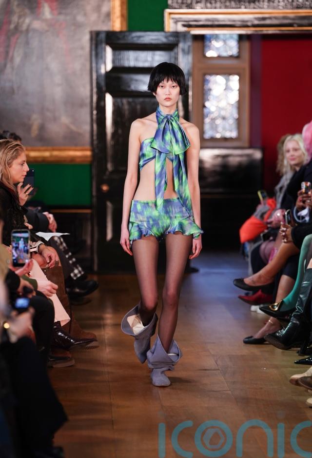 The Ukrainian-born London-based designer, known for her high-fashion denim, presented a smorgasbord of colours, cuts and textures, one of the first being a sheer-legged look in a fluid green-and-blue printed set: a halter top knotted into an exaggerated bow at the neck and paired with ruffled micro shorts worn over fine black tights. Slouched boots pooled around the ankles, fortifying the undone atmosphere.