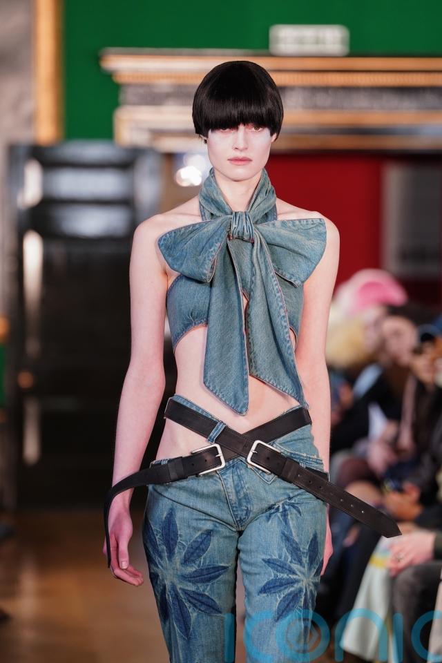 Denim – Popova’s signature – was pushed into more tailored territory. One look featured a halter-style denim top tied into a large bow across the chest, cut away at the midriff and paired with low-slung jeans secured by crossed leather belts that wrapped diagonally around the hips.