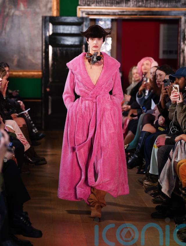 Sleepwear references were literal at times. A full-length hot-pink robe coat, plush and enveloping, was styled for the runway rather than the bedroom, its exaggerated collar and belted waist elevating the domestic into statement outerwear.