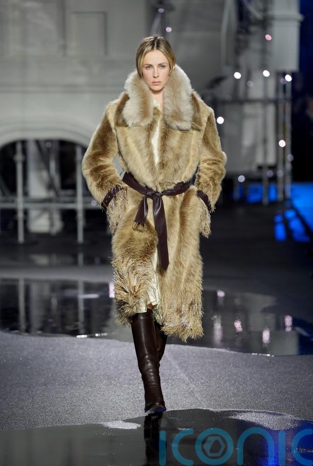 Fur in varying lengths and finishes was a defining feature of the AW26 collection. One standout look featured a cream and caramel-toned fur coat cinched with a dark leather belt and worn over a soft ivory dress.