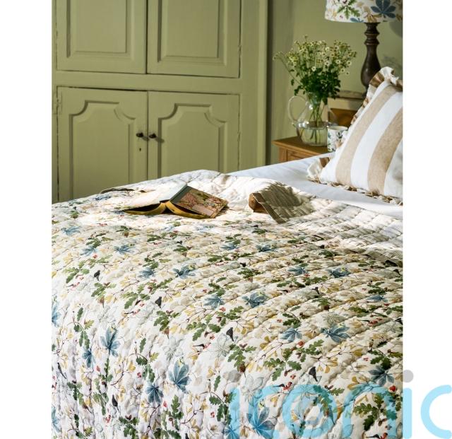 Featuring garden songbirds and autumnal foliage, a warm sense of nostalgia surrounds this cosy, quilted throw. With hand-stitched detailing and a classic ticking stripe on the reverse, it’s one to embrace the cottagecore aesthetic; drape over an accent chair or layer up on a bed. Presented in a pull-string bag, it’s a charming way to embrace country living.