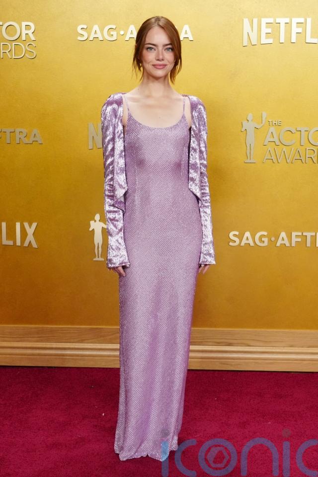 Emma Stone, 37, dazzled in a lilac-encrusted slip gown by Louis Vuitton, the delicate sparkle and matching bolero nodded to flapper-era beading, while the clean, elongated silhouette kept the look contemporary.