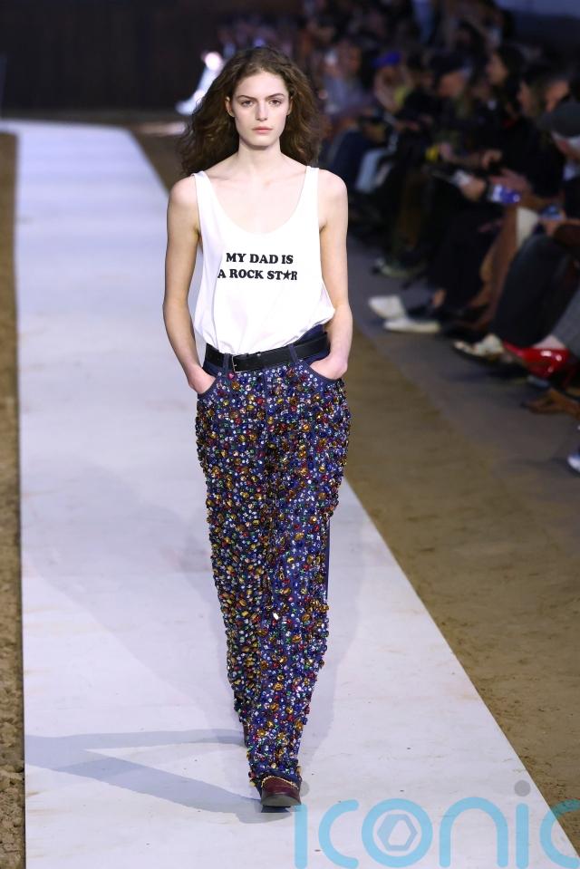 Chunky rhinestone embellishments appeared across tops, dresses and even denim, channelling the excess of the Eighties while remaining consistent with McCartney’s playful design motifs. One model appeared in rhinestone jeans wearing a white vest emblazoned with the phrase: “My dad is a rock star”.