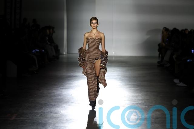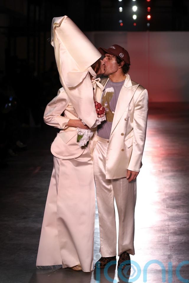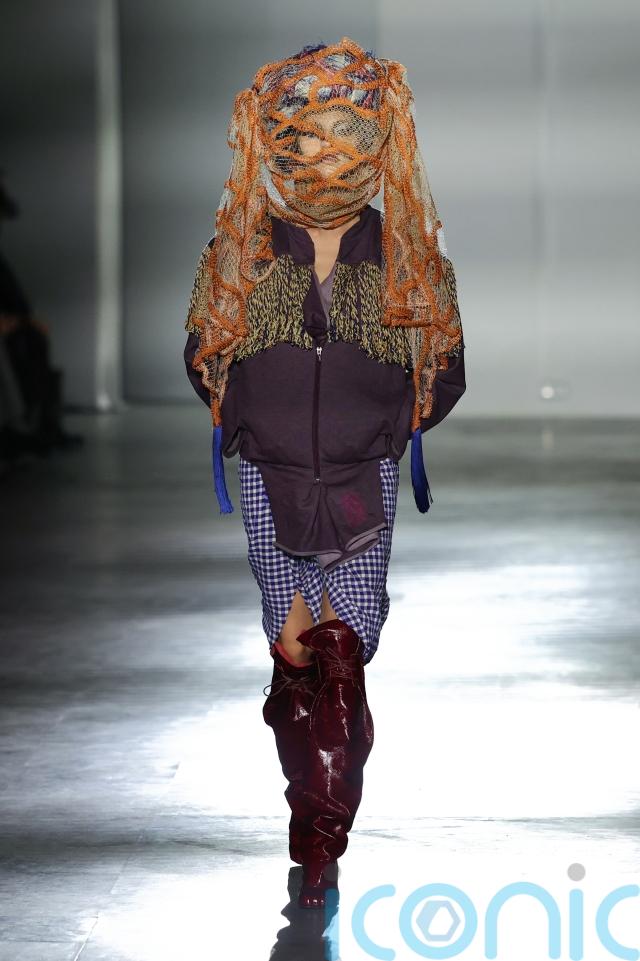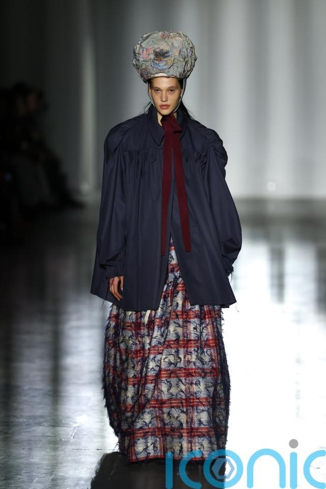 One look featured an oversized coiled headpiece wrapped around the model’s head like a sculptural halo, highlighting the London label’s reputation for bold and eccentric styling.