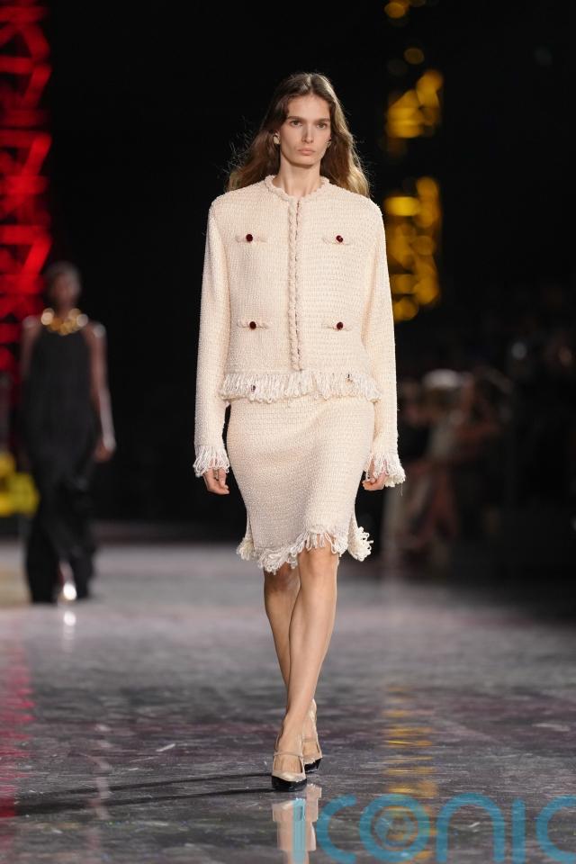 Another look presented a cream tweed jacket and matching skirt finished with softly frayed edges, introducing a slightly relaxed take on the classic two-piece set, while maintaining the elegant structure synonymous with Chanel.