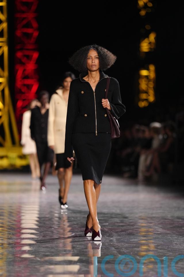 The show opened with one of the house’s most recognisable signatures: the tweed skirt suit. A black ribbed skirt suit fastened with gold buttons offered a refined take on the classic silhouette, paired with pointed heels and a structured handbag.