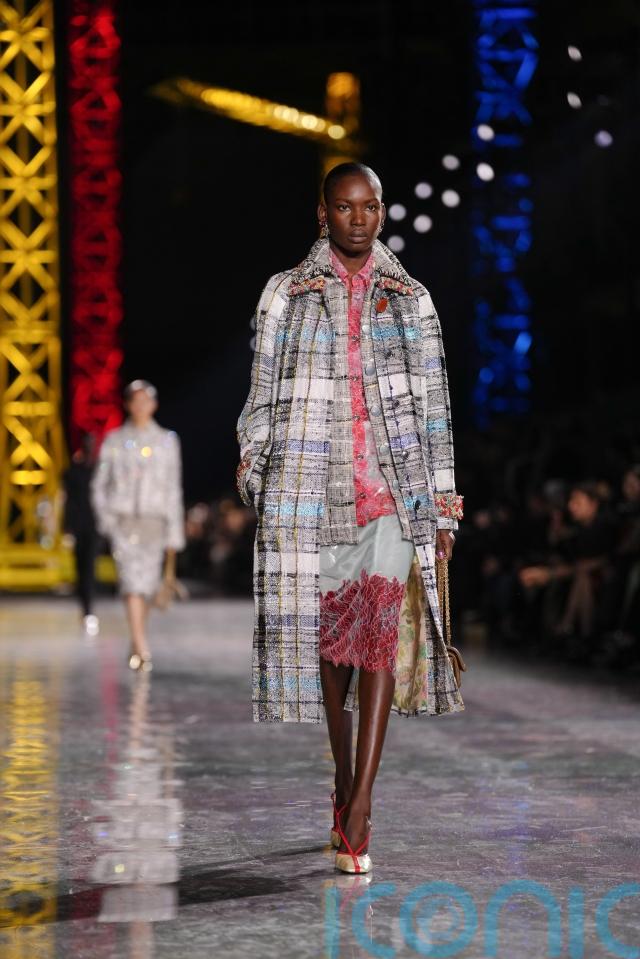 One sleeveless look featured intricate embellishment, while another paired a checked coat with a delicately detailed skirt that incorporated lace and embroidery.