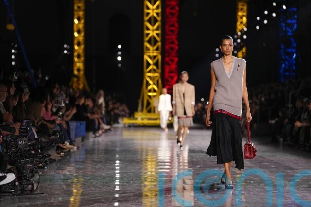 The show took place beneath the vast glass roof of the Grand Palais, where towering crane structures lit in primary colours transformed the venue into what resembled a construction site.
