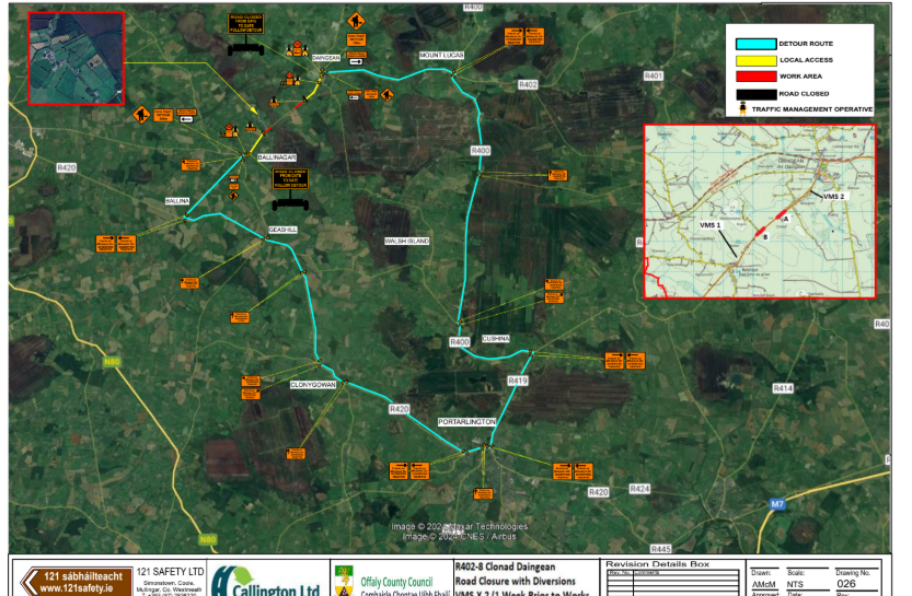 Traffic Travelling West to divert onto the R400 (South) at Mount Lucas to Portarlington and onto the R420 towards Tullamore