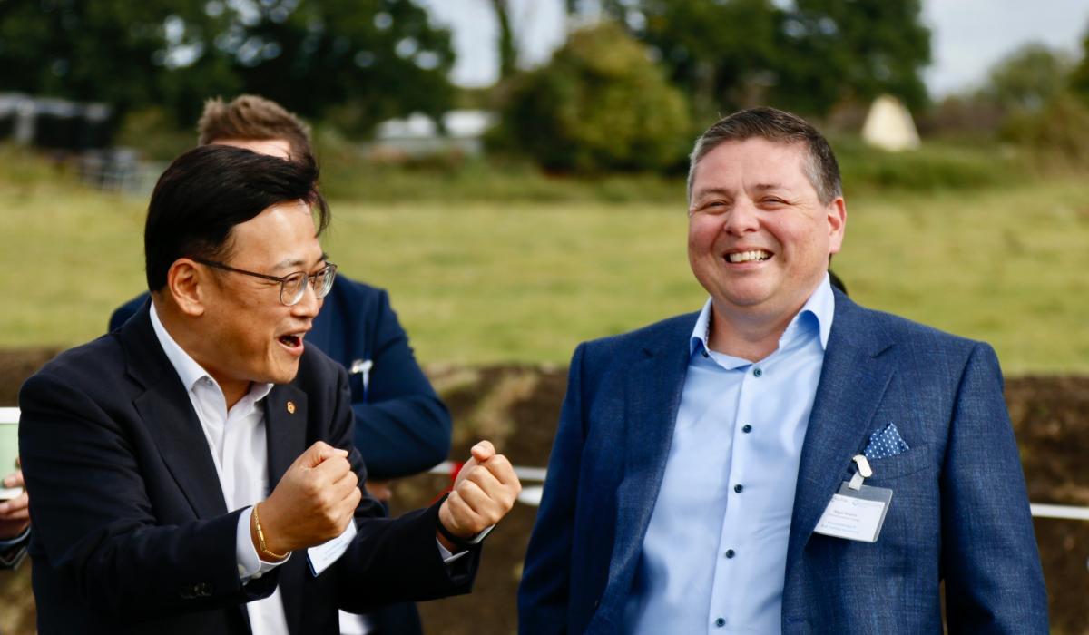 Hanwha CFO Won Young Yung shares a joke with Lumcloon Energy CEO Nigel Reams at the Offaly Shannonbridge B project launch