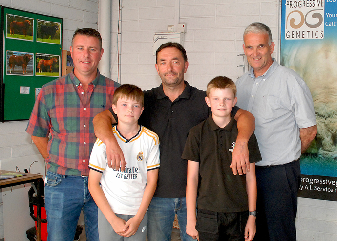 Pictured is winner of the Champion Bullock and second in the Champion Heifer category, Seamus Fox (centre), with Adrian Walsh (Judge), Lucas Murphy, Brandon Murphy and Michael Harty (Manager). Photo: PJ Wright