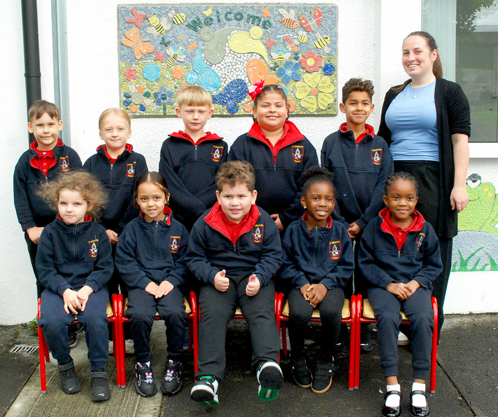 Pictured on their first day in school are St Cronan's National School in Rosemount Junior Infants Class of 2025 with their Class Teacher, Clodagh Lalor. Photos: PJ Wright