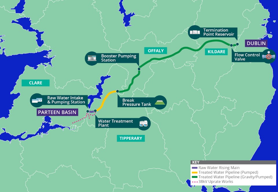 The Water Supply Project Eastern and Midlands Region proposes to abstract water from Parteen Basin, upstream of Parteen Weir on the Lower River Shannon, utilising a maximum of 2% of the long term average flow at Parteen Basin. It is proposed that the water will be treated near Birdhill, County Tipperary and treated water will then be piped 170km through counties Tipperary, Offaly and Kildare to a termination point reservoir at Peamount in County Dublin, connecting into the Greater Dublin Area water distribution network (see map below).