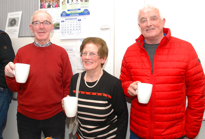 Pictured enjoying a cuppa at Age Friendly Roscrea's Christmas Rambling House are Michael and Bridge Doran and Mick Murphy, who all sang on the night. Photo: PJ Wright