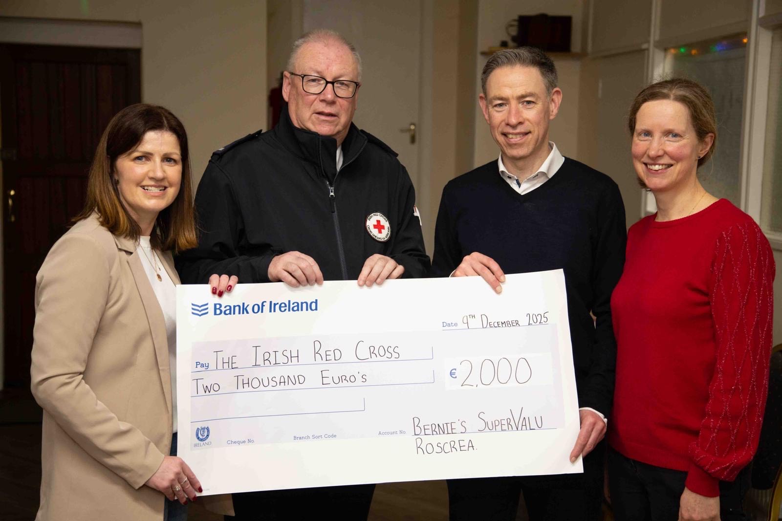 Pictured above at Bernie’s SuperValu Christmas Customer Morning are the Irish Red Cross who received a cheque of €2,000 from Brian Colclough on behalf of Bernie’s SuperValu and their customers, who have generously contributed to bucket collections throughout the year.
