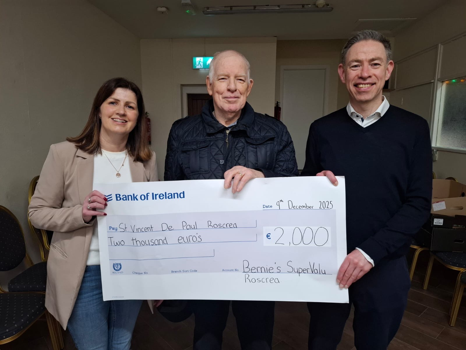 To facilitate the excellent work of the Society of St Vincent de Paul Roscrea, Brian Colclough presented them with a cheque of €2,000. Pictured below are Deirdre Moore, Bernie’s Manager; Tony Brennan, St Vincent de Paul, Roscrea and Brian Colclough, Bernie’s.