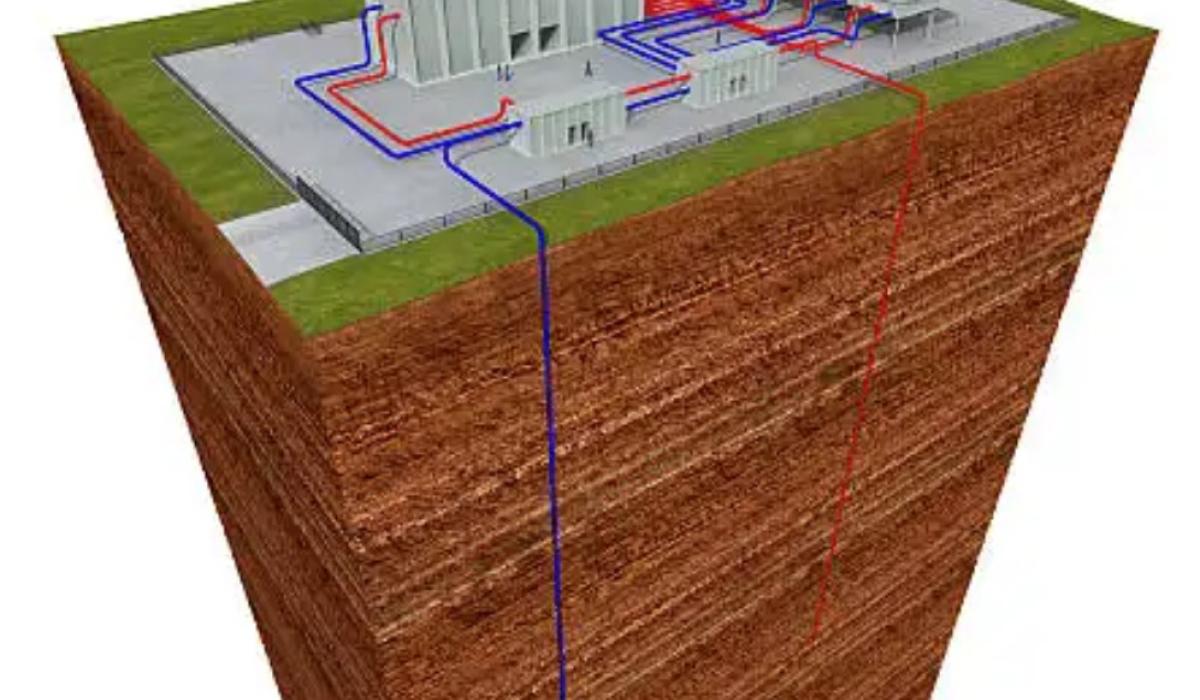A geothermal system with a cutting through the earth and deep holes.