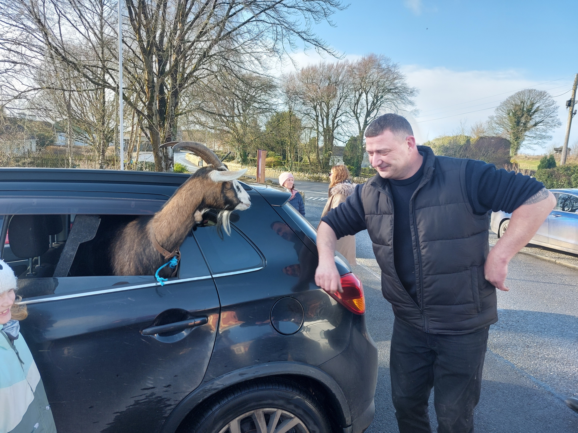 L. to r. Martin O'Brien, the owner of the goat, Nellie, and Dan Lynch.
