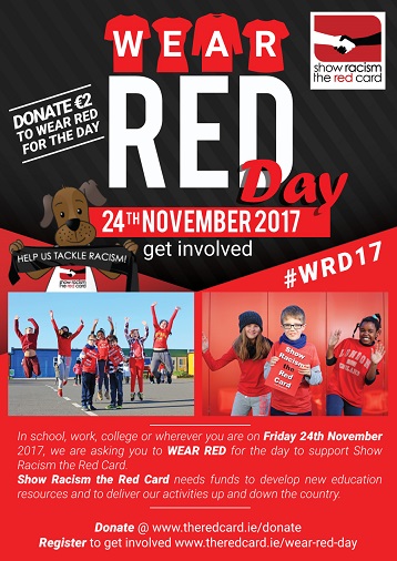 Show Racism the Red Card is calling on the public to wear red Friday, November 24, and donate €2 to help raise much needed funds for the charity.
