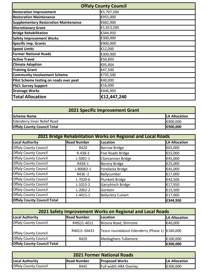 Further to this. €160,000 will be spent on safety improvement at the Tesco roundabout in Edenderry which is connected to the inner relief road project.