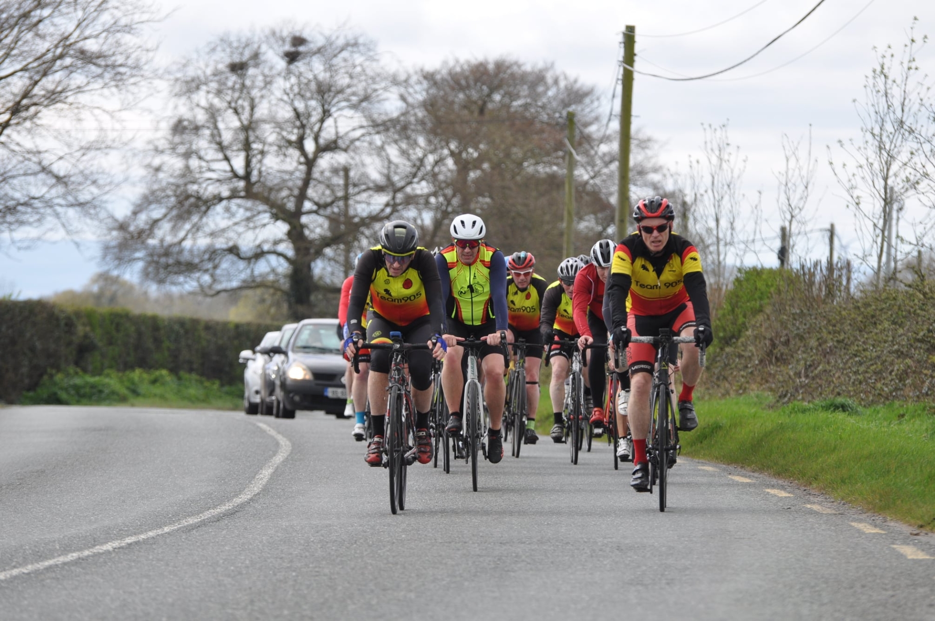 Kieran Brierty leads a group of riders close to the finish of the PJMC