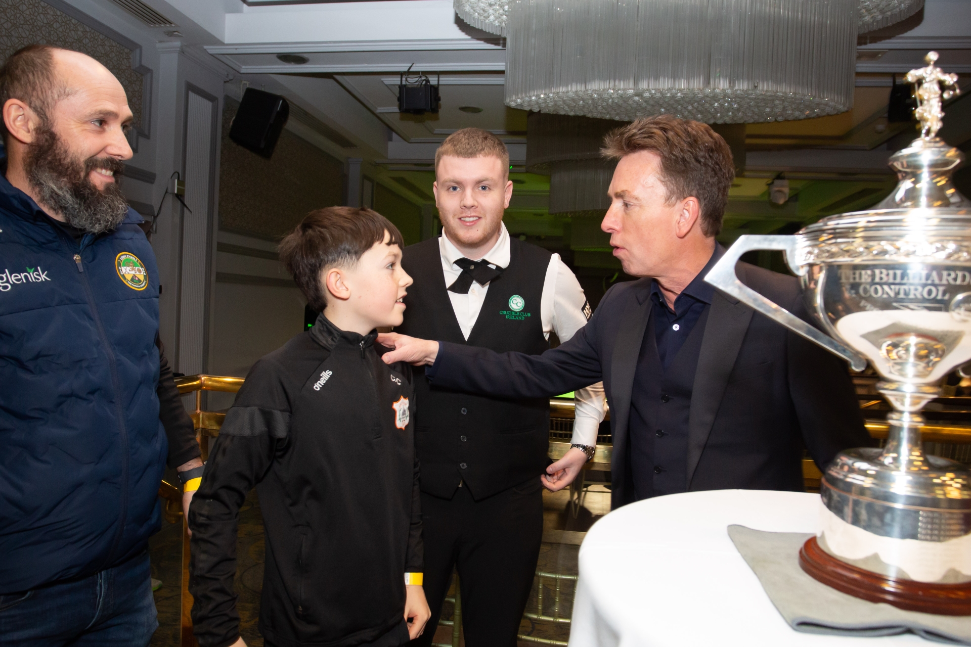Young Conor Cahill and dad Trevor (left) gets to meet his snooker heroes Ken Doherty and Aaron Hill at a snooker exhibition at the Bridge Hotel on Thursday night.