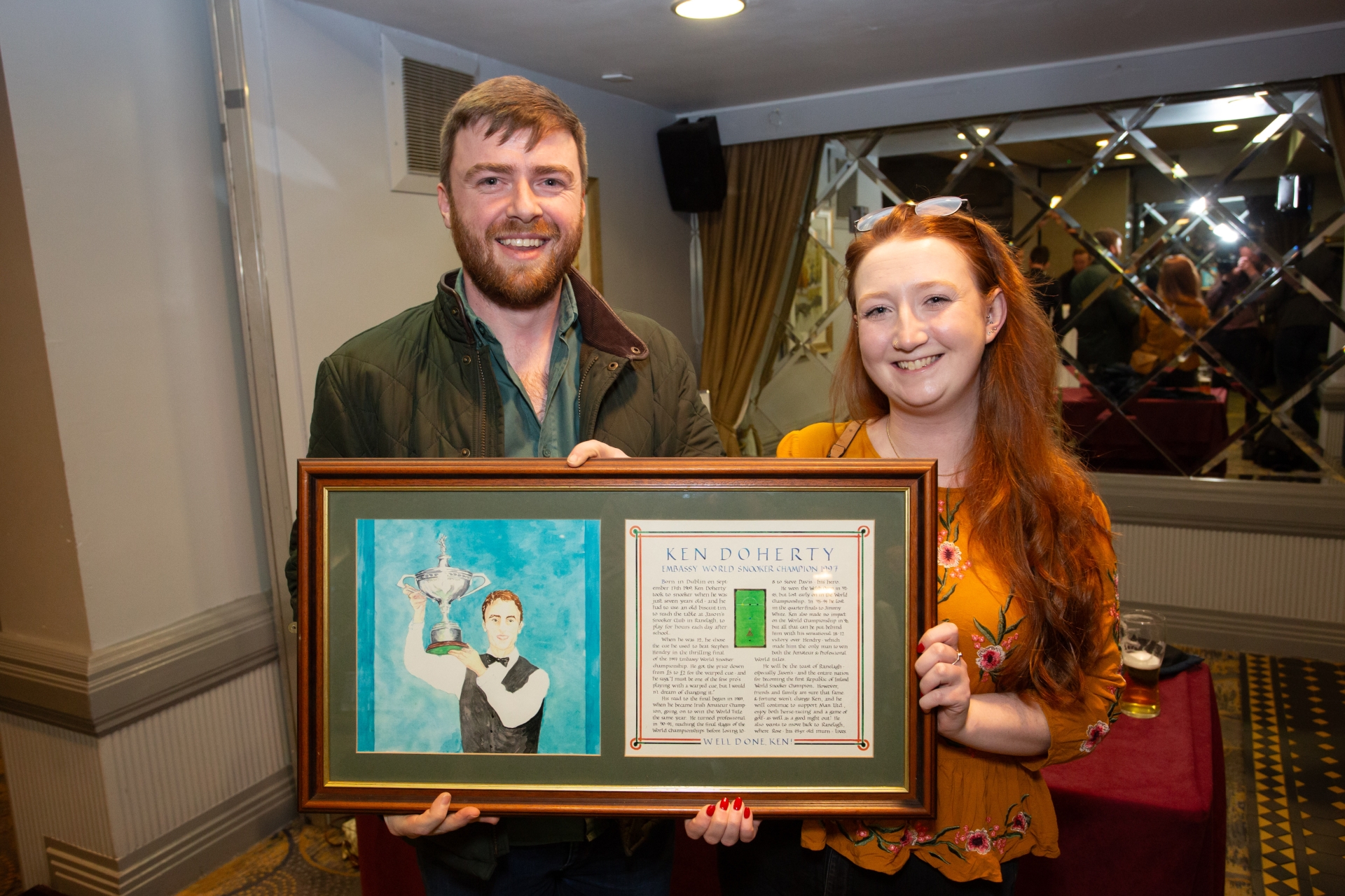 Eugene Brennan and Jessica Cassidy with a picture of Ken Doherty Eugene bought when Carlow Snooker club was selling off memorabilia they brought to show the man himself.