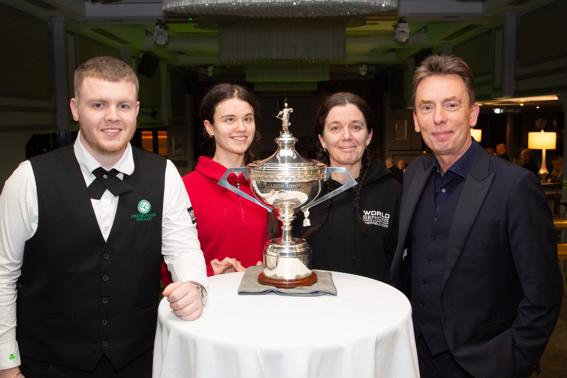 Lisa and mum Amy Keating got to have a photo with Aaron Hill and Ken Doherty and the World Snooker Championship trophy before the exhibition match.
