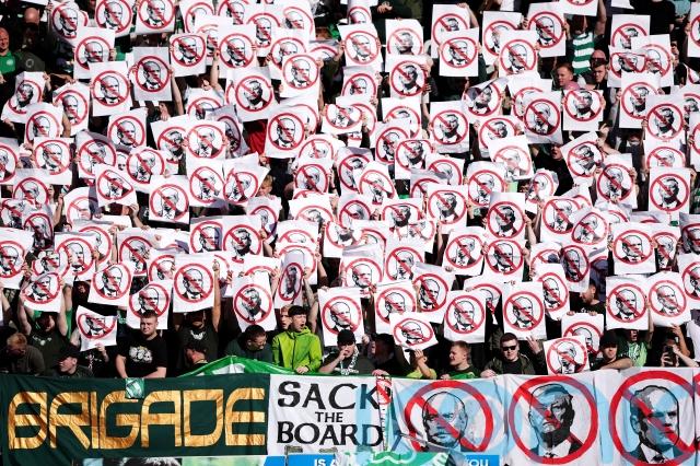 Thousands of visiting fans held up posters featuring photographs of key directors with red diagonal crosses through their faces, and chants of “all Celtic fans against the board” and “sack the board” rang out as the teams emerged from the tunnel at Firhill.