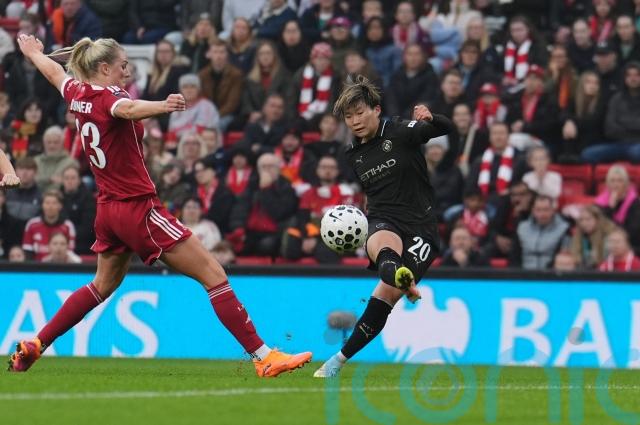 Manchester City sit one point behind Chelsea after Aoba Fujino found a late winner to beat Liverpool 2-1.